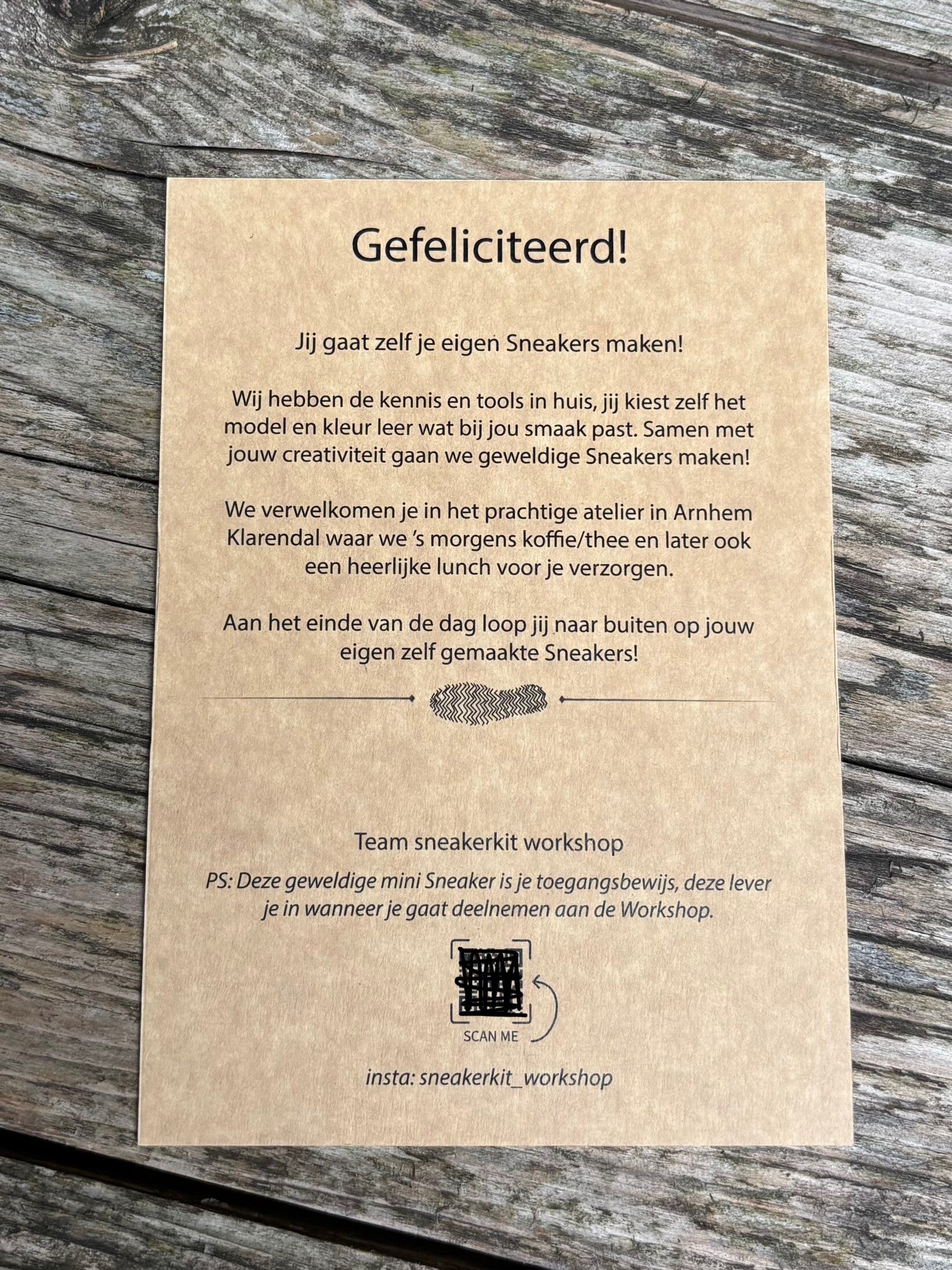 In het doosje zit ook een leuke kaart met een korte uitleg over het cadeau, de workshop sneakers maken in 1 dag! Scan de QR code op de kaart en plan een datum in.